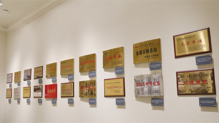 位于博物馆二楼东侧,面积95平方米。以淡雅的金色作为整个空间的主色调,分为领导关怀和荣誉展示两个部分。展厅介绍了从党和国家领导人到历届各级领导,深入甘肃公路工作现场检查指导、巡视调研、慰问关怀的情况。同时,展出了近年来甘肃公路系统单位和集体、先进生产者和劳动模范获得的省部级以上荣誉。