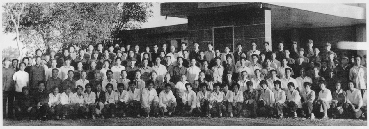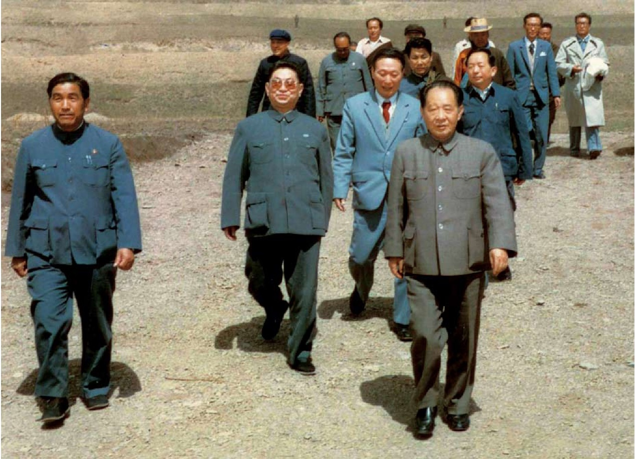 1979年8月,中共中央副主席邓小平(二排左10)、国务院副总理王震(二排左9)、王任重(二排左11)和中共甘肃省委兰州军区领导在敦煌接见抢修红当公路的干部职工代表