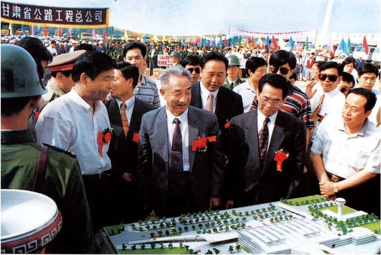 1997年6月,时任国务院副总理邹家华(前排居中)视察我省交通部门承建的中川机场扩建工程