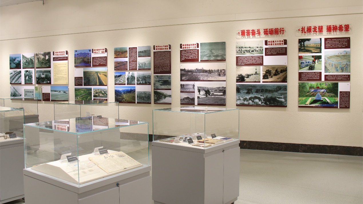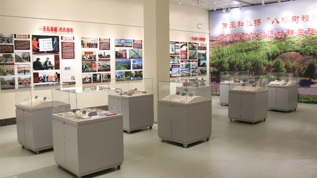 该厅位于博物馆二楼东侧,正面以八棵树大型彩色喷绘,展示面积为95平方米。展厅以“两路”精神为开篇,用图片的语言阐述“八棵树精神”是甘肃交通人践行习近平总书记对“两路”精神实质内涵重要指示批示的具体行动和生动实践。展厅分两个部分,“两路”精神3个单元,“八棵树精神”4个单元。