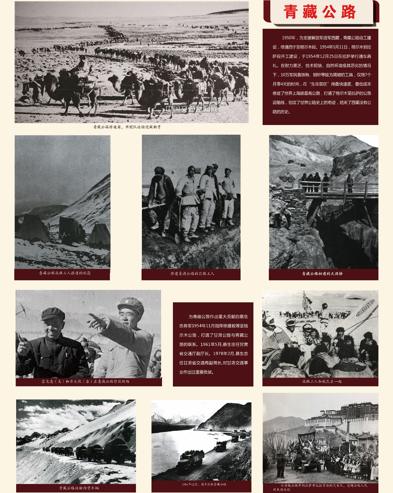 1950年,为支援解放军进军西藏动工建设,修通西宁至格尔木段。1954年5月11日,格尔木到拉萨段开工建设,于1954年12月25日在拉萨举行通车典礼。在财力匮乏、技术短缺、自然环境极其恶劣的情况下,10万军民,靠铁锹、钢钎等极为简陋的工具,仅用7个月零4天的时间,在“生命禁区”用最快速度、最低成本修建了世界上海拔最高公路,打通了格尔木至拉萨的公路运输线。青藏公路是世界上海拔最高的公路之一,创造了世界公路史上的奇迹,结束了西藏没有公路的历史。