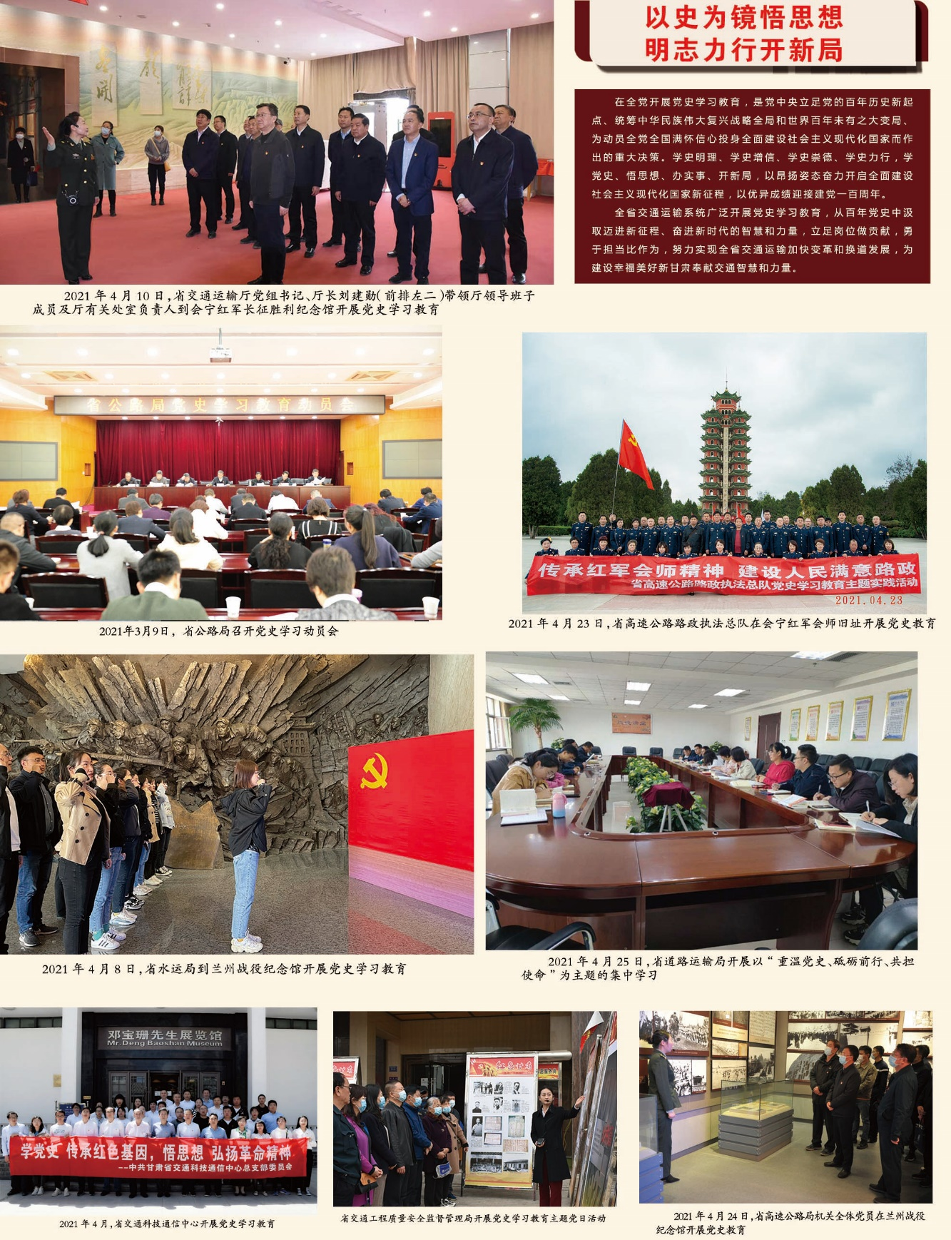 全省交通运输系统广泛开展党史学习教育,从百年党史中汲取迈进新征程、奋进新时代的智慧和力量,立足岗位做贡献,勇于担当比作为,努力实现全省交通运输加快变革和换道发展,为建设幸福美好新甘肃奉献交通智慧和力量。