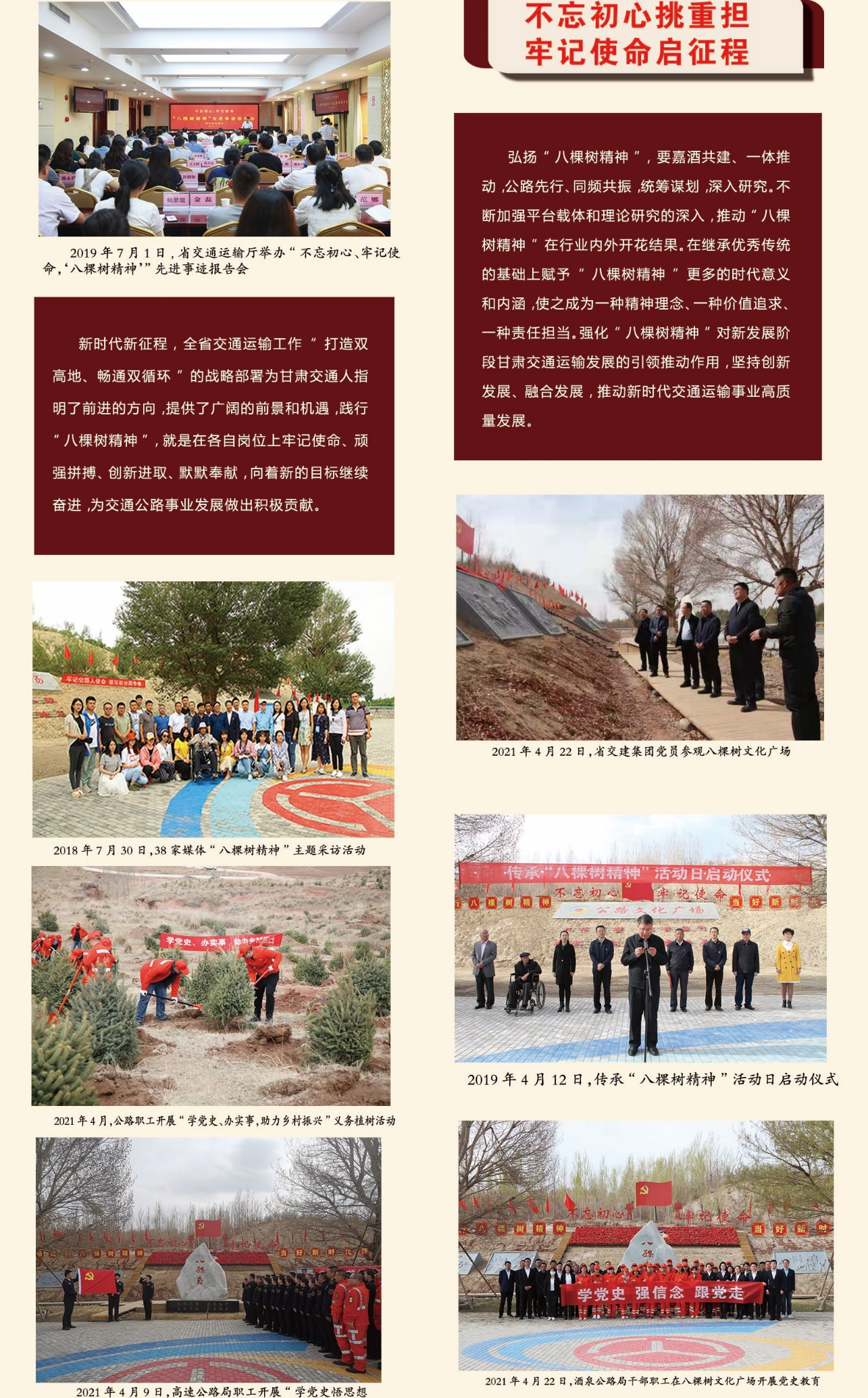 “八棵树精神”是甘肃交通人践行习近平总书记对“两路”精神实质内涵重要指示批示的具体行动和生动实践。