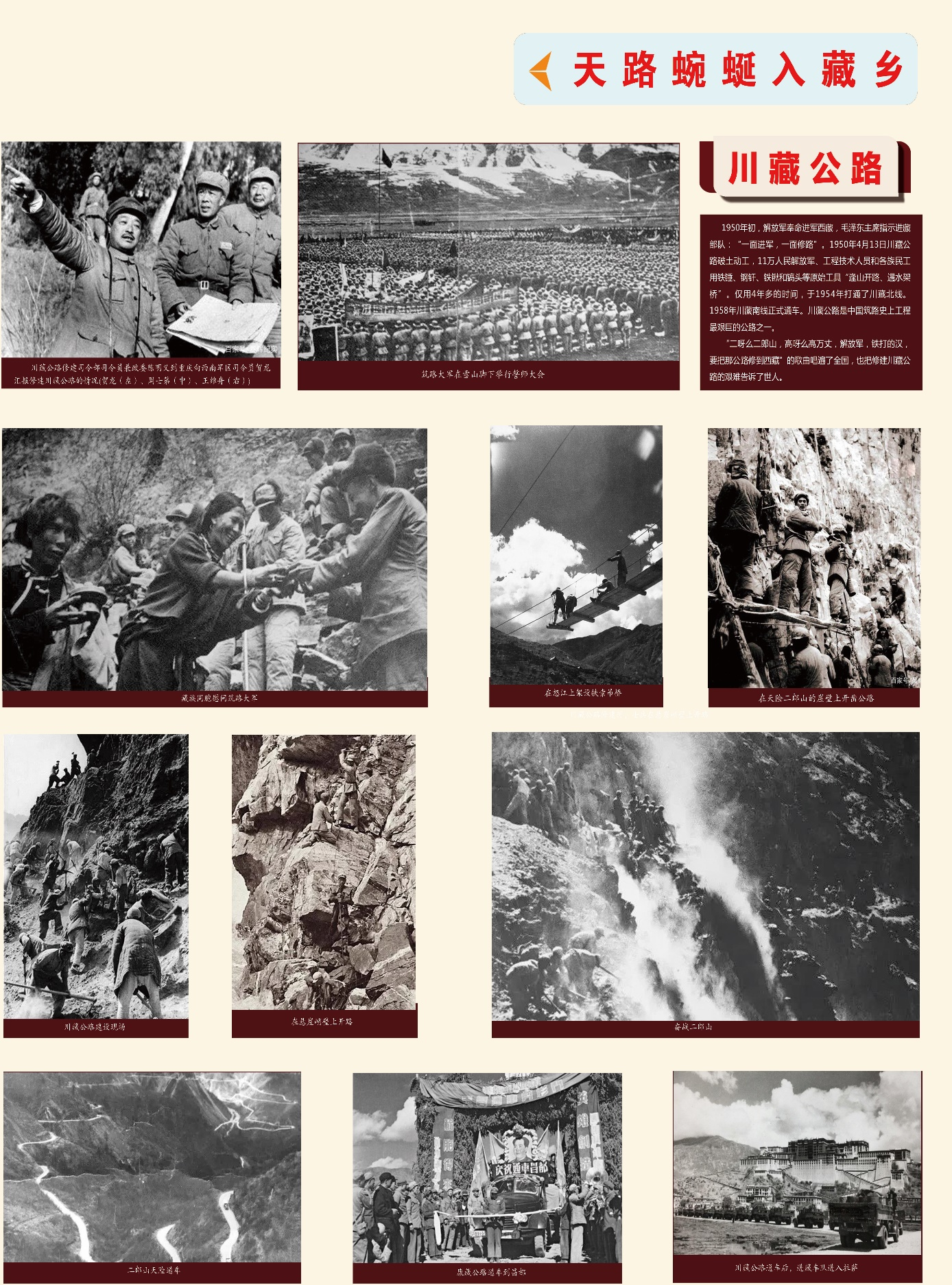 1950年初,解放军奉命进军西藏,毛泽东主席指示进藏部队:“一面进军,一面修路”。1950年4月13日川藏公路破土动工,11万人民解放军、工程技术人员和各族民工用铁锤、钢钎、铁锹和镐头等原始工具“逢山开路、遇水架桥”。仅用4年多的时间,于1954年打通了川藏北线。1958年川藏南线正式通车。川藏公路是中国筑路史上工程最艰巨的公路之一。