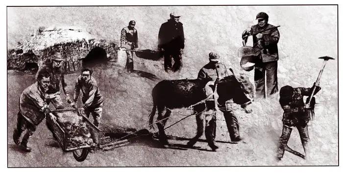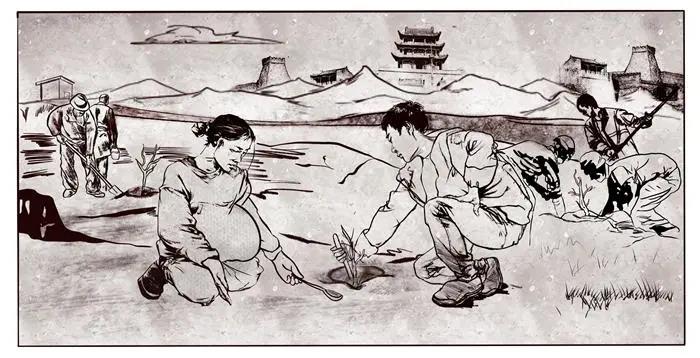 郑占乾带领工友和他怀孕四个月的妻子植树播绿的场景
