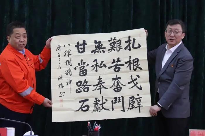 刘建勋厅长代表厅党组向嘉峪关公路局赠送“扎根戈壁、艰苦奋斗、无私奉献、甘当路石”的“八棵树精神”书法作品