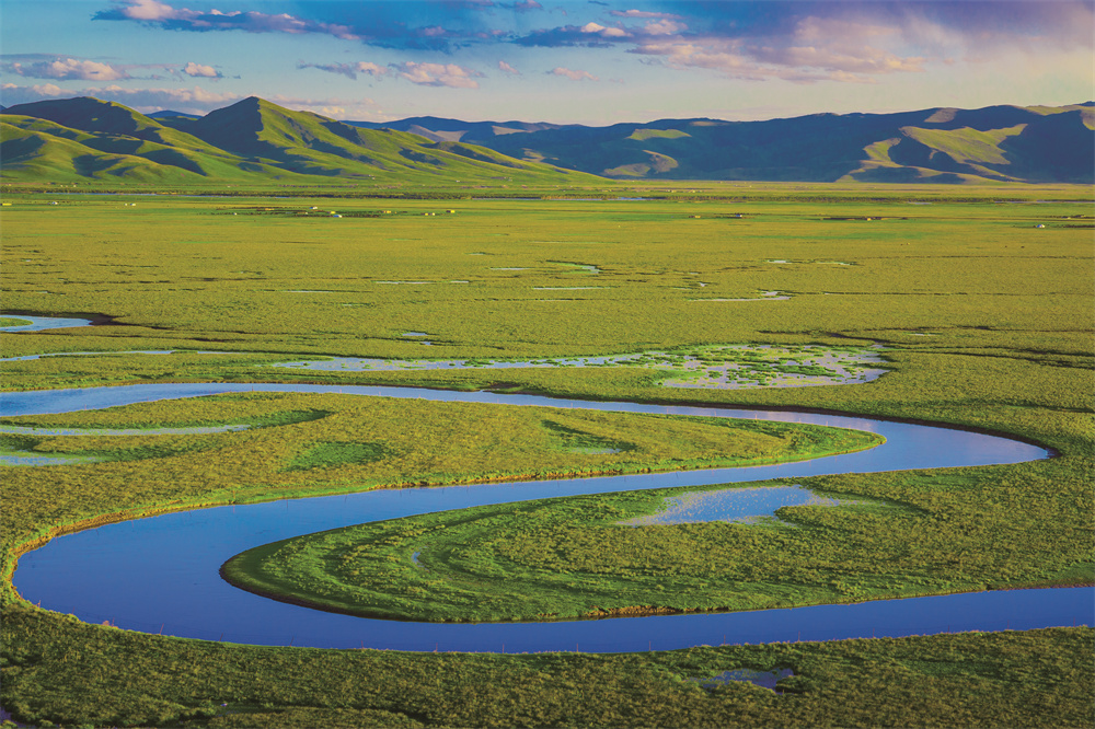 背景资料:阿万仓湿地,又名贡赛喀木道湿地,藏语意为贡曲、赛尔曲、道吉曲三条河流与黄河汇流之地。近年来,甘肃深入贯彻落实黄河流域生态保护和高质量发展战略,担好上游责任,展现上游作为。制定《甘肃省黄河流域生态保护条例》,在全国率先启动黄河流域生态环境与污染现状调查,建成黄河流域生态环境基础数据库。安排中央水污染防治资金18.3亿元,实施了109个重点流域水污染防治、良好水体保护和水源地规范化建设项目,开展黄河流域干流生态补偿,与上下游4省份建立跨界流域水污染联防联控机制。全面完成沿黄30个省级及以上工业园区污水集中处理设施建设,累计完成29台1081.5万千瓦火电机组超低排放改造。沿黄54座城镇生活污水处理厂完成提标改造,甘肃黄河流域14条地级城市建成区黑臭水体均达到长制久清目标。“十三五”以来国家下达的9项约束性指标全部超额完成,黄河干流甘肃段全流程达到Ⅱ类,出境断面水质连续6年稳定达到Ⅱ类。2021年黄河流域41个国考断面水质优良比例为92.68%,空气质量总体稳步改善,土壤环境质量保持稳定,环境风险有效防控,各项约束性指标达到了国家考核目标要求,确保“一河清水向东流”。