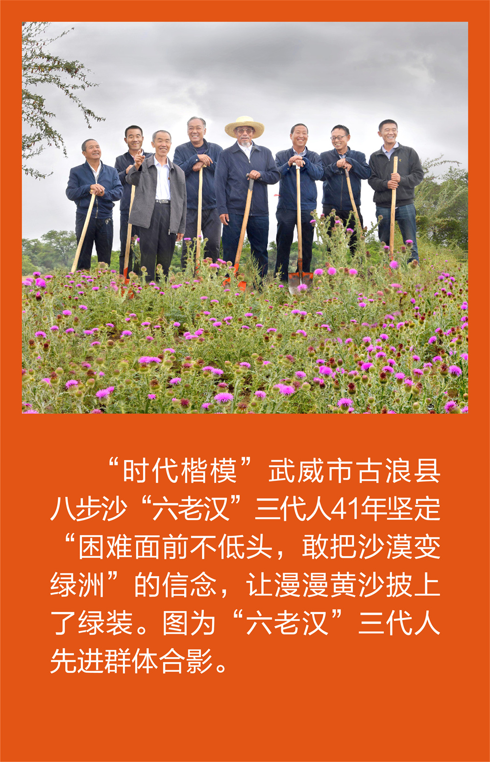 图40:“时代楷模”武威市古浪县八步沙“六老汉”三代人41年坚定“困难面前不低头,敢把沙漠变绿洲”的信念,让漫漫黄沙披上了绿装。图为“六老汉”三代人先进群体合影。