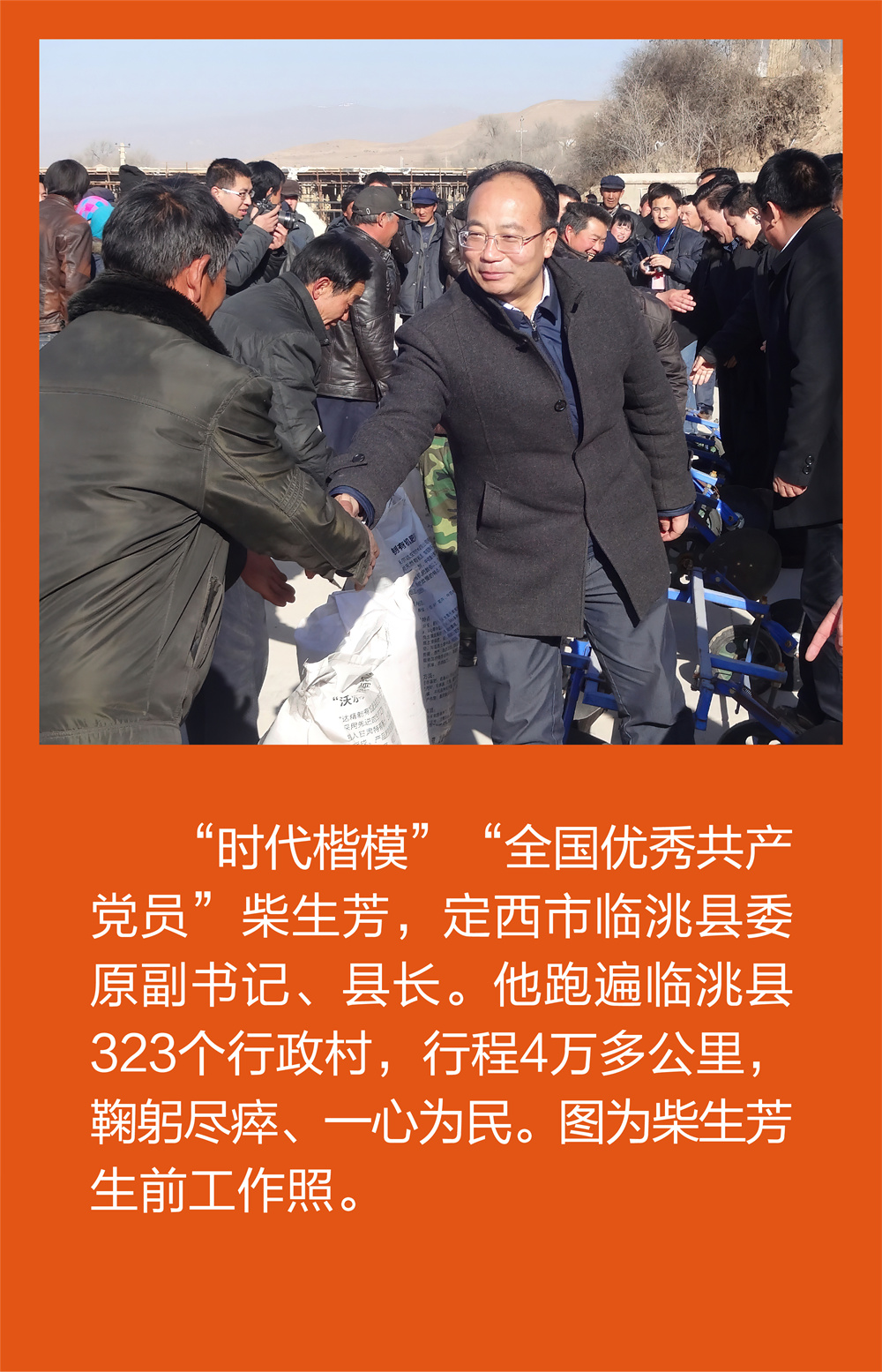 背景资料:柴生芳同志生前系甘肃省临洮县委副书记、县长。在临洮县工作的4年时间里,他夙夜在公、全身心扑在党和人民的事业上,每天工作都在12小时以上,调研提出“五个到村到户”精准扶贫工作思路,为临洮县300多个村确定了主导产业,创建了“全省精准扶贫示范县”。他心系百姓、情系民生、勇于担当,跑遍了全县323个行政村,走访和接待群众近5000人次,千方百计解决群众吃水难、行路难、上学难、看病难等现实问题。因长期超负荷工作,劳累过度,诱发心源性猝死,于2014年8月15日凌晨在办公室不幸去世,年仅45岁。被追授“时代楷模”“全国优秀共产党员”等荣誉称号。