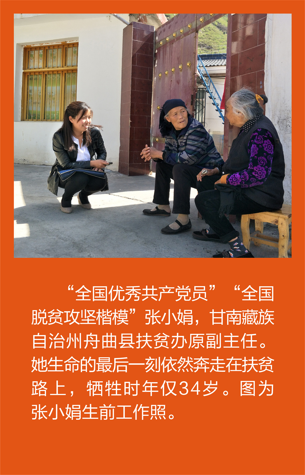 背景资料:张小娟,2008年大学毕业后,毅然返回家乡,一直坚守在甘肃民族地区农村基层和脱贫攻坚一线。11年来,她的足迹遍布舟曲县19个乡镇、208个行政村,为舟曲全县脱贫摘帽作出重要贡献。她舍小家顾大家,积极为山区群众脱贫致富奔走,无暇照顾年迈的父母和年幼的孩子,却成为百姓心中牵挂的“乖女儿”。她用最美的青春扎根基层、回馈家乡,用最好的芳华践行初心、履行使命,为广大党员干部和青年同志树立了榜样。2019年10月7日,时任舟曲县扶贫开发办公室副主任的张小娟完成舟曲乡村脱贫攻坚抽样调查工作,返程途中因交通事故不幸殉职,年仅34岁。被追授“全国三八红旗手”“全国优秀共产党员”“全国脱贫攻坚楷模”等荣誉称号。