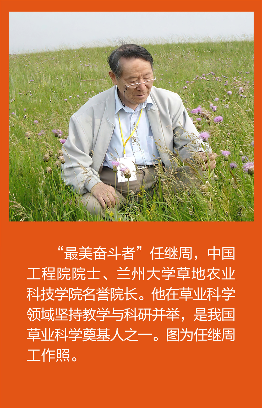 背景资料:任继周,中国工程院院士,兰州大学草地农业科技学院名誉院长、教授,中国草业科学奠基人之一、现代草业科学的开拓者。自1950年参加工作以来,任继周扎根西北七十余载,几乎参与了中国草业科学发展的每一个阶段,创造了多个国内外“第一”:提出国际上第一个适用于全世界的草地分类系统、带领学术集体提出评定世界草原生产力的“畜产品单位”,建立中国第一个高山草原试验站、研制出第一代草原划破机——燕尾犁、主编第一本《草原学》教材、创建农业院校第一个草原系、主持制订第一个全国草原本科专业统一教学计划、成为我国第一位草原学博士生导师、负责的课程获国家教学成果特等奖。开创了中国农业伦理学研究先河,在90岁高龄主编并出版《中国草业系统发展史》《中国农业伦理学史料汇编》《中国农业伦理学导论》《中国农业伦理学概论》等专著和教材,用哲学的终极探索,回应学科发展的方向问题。