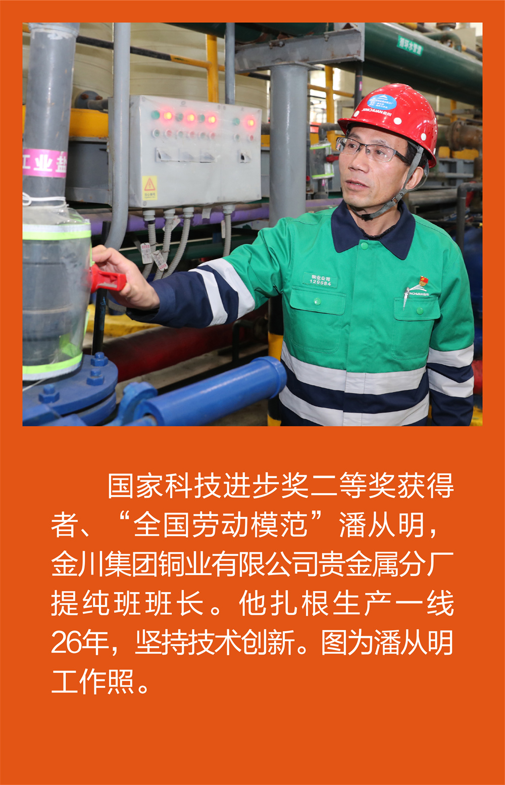 图44:国家科技进步奖二等奖获得者、“全国劳动模范”潘从明,金川集团铜业有限公司贵金属分厂提纯班班长。他扎根生产一线26年,坚持技术创新。图为潘从明工作照。