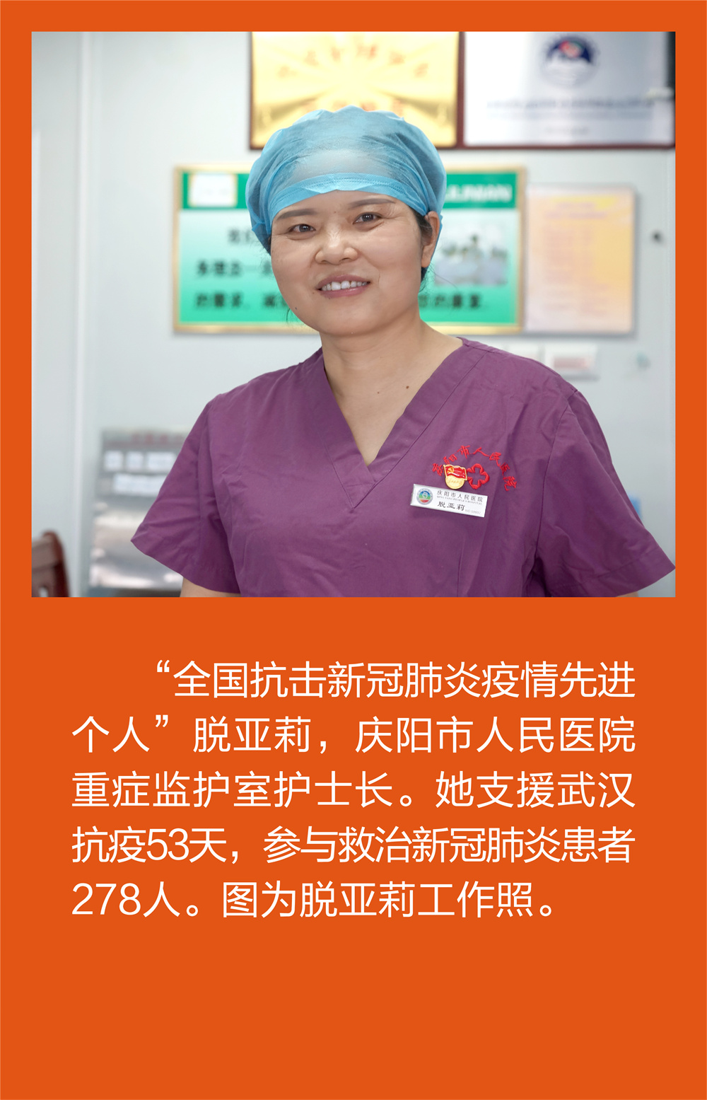 背景资料:脱亚莉,庆阳市人民医院重症监护室护士长、主任护师,庆阳市第一批援鄂医疗队队长。她从事护理工作28年,始终秉承南丁格尔精神,毫不保留地把自己的一切奉献给了护理事业。在抗击非典疫情、汶川地震救援、援助湖北抗击新冠疫情中,她不顾生死、逆向而行,为患者解除伤痛,为同事排忧解难,有她的地方就充满了生命的希望。汶川地震中,她不顾个人安危,只身一人在地震险情中返回病房转运患儿。在带队援鄂抗疫中,她三次主动请缨去危重症病区工作,两次冒着被感染的危险成功化解疫情扩散风险,援助湖北53天,她参与救治新冠肺炎患者278人,实现了全体队员零感染、零事故,赢得了患者和重症组的高度赞誉。先后荣获“全国抗击新冠肺炎疫情先进个人”“第48届南丁格尔奖章”“感动甘肃.陇人娇子”“全国三八红旗手”等荣誉称号。