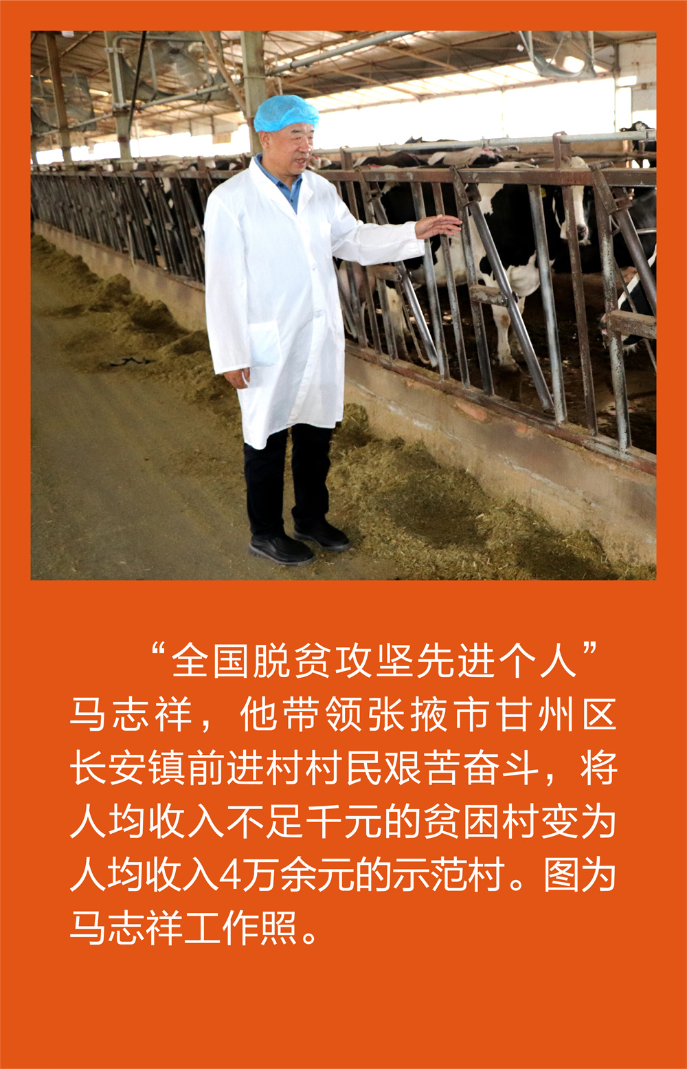 背景资料:马志祥,甘肃省张掖市甘州区长安镇前进村党委书记、甘肃前进牧业科技有限责任公司董事长。自2001年担任村党委书记以来,他以一个共产党员埋头苦干的精神和气魄,将2001年人均收入不足千元的贫困村发展到如今人均纯收入4万余元的示范村,闯出了一条“生产专业化、生活社区化、环境田园化、农民知识化”的发展路子。他带动全村建造日光温室236座,种植红提葡萄540亩,使前进村成为远近闻名的蔬果种植基地。他带领村民创办了张掖市第一家奶牛养殖合作社,经过14年的发展,前进牧业成为拥有员工1100多人、牧场20个、奶牛5000头,下属2个乳品加工厂及饲草基地、有机肥厂的全产业链公司,先后被评为农业产业化国家重点龙头企业、部级标准化示范场、优质奶源基地、全国最美十大牧场。探索建立了前进村村民养老保障制度,为60岁以上老人每月发放100至800元不等的生活补贴。为甘州区152户建档立卡贫困户每户配股2万元,每年按照配股资金10%的红利分红,优先吸纳贫困户就业,扶持他们走出了贫困。2018年在甘肃省东乡县建起扶贫牧场,吸收24个村、18个专业合作社加入肉牛养殖行业,2689户贫困户通过肉牛养殖脱贫致富。先后荣获“全国十佳农民”“全国脱贫攻坚先进个人”、全国“五一”劳动奖章、“感动甘肃·陇人骄子”等荣誉称号。