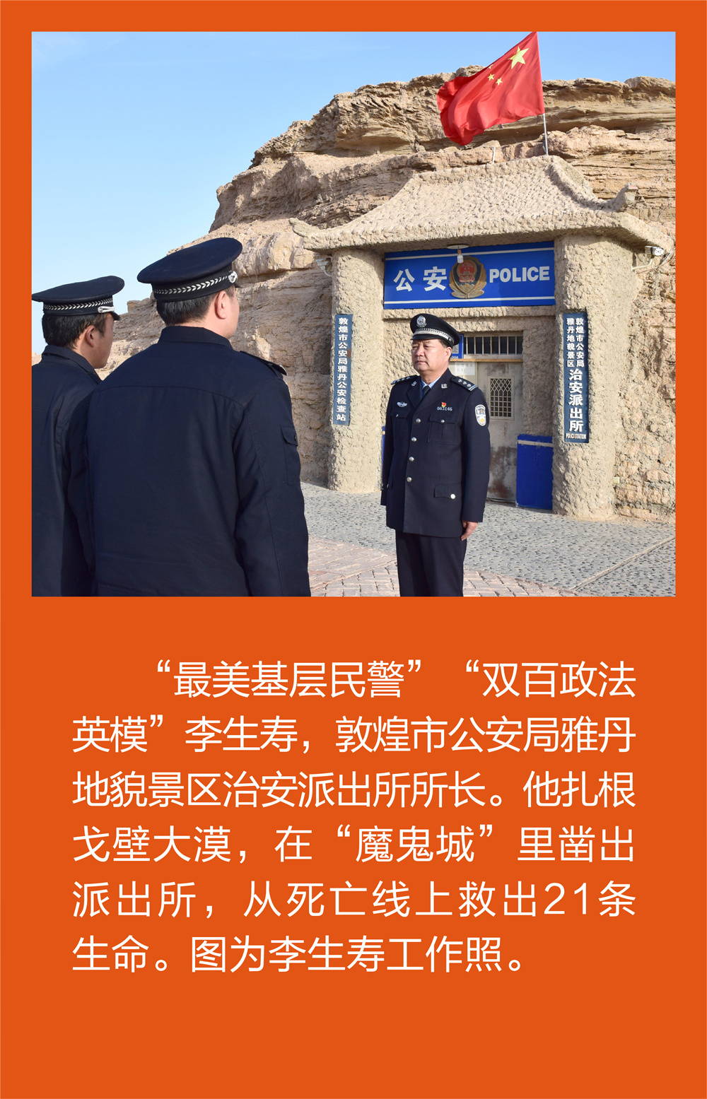 背景资料:李生寿,退休前系敦煌市公安局雅丹世界地质公园治安派出所所长兼雅丹公安检查站站长、二级高级警长。从警24年来,他把人生中最美好的时光、最精彩的年华、最火红的青春奉献给了公安事业,用实际行动践行了“立警为公、执法为民”的铮铮誓言。自1998年脱下军装又穿上警服,他二十多年如一日,坚守在大漠戈壁,奋战在生命禁区,硬是在坚如磐石的雅丹体上开凿出了全国独一无二的窑洞派出所,也锻造出了坚韧不拔的“雅丹精神”。他带领站所民警饮风餐沙、爬冰卧雪,与长风同舞,和大漠为伴,用脚步一遍遍丈量着辖区近四百平方公里的生命禁区,没有让一个“带病”车辆、人员、物品从他们眼前溜走。先后完成罗布泊探险遇难救助任务170次,从死亡线上救回了21条鲜活的生命,被人们誉为“沙海灯塔”。先后荣获“全国模范退役军人”“全国公安机关二级英雄模范”“全国最美基层民警”“双百政法英模”“甘肃省最美人物”等荣誉称号。