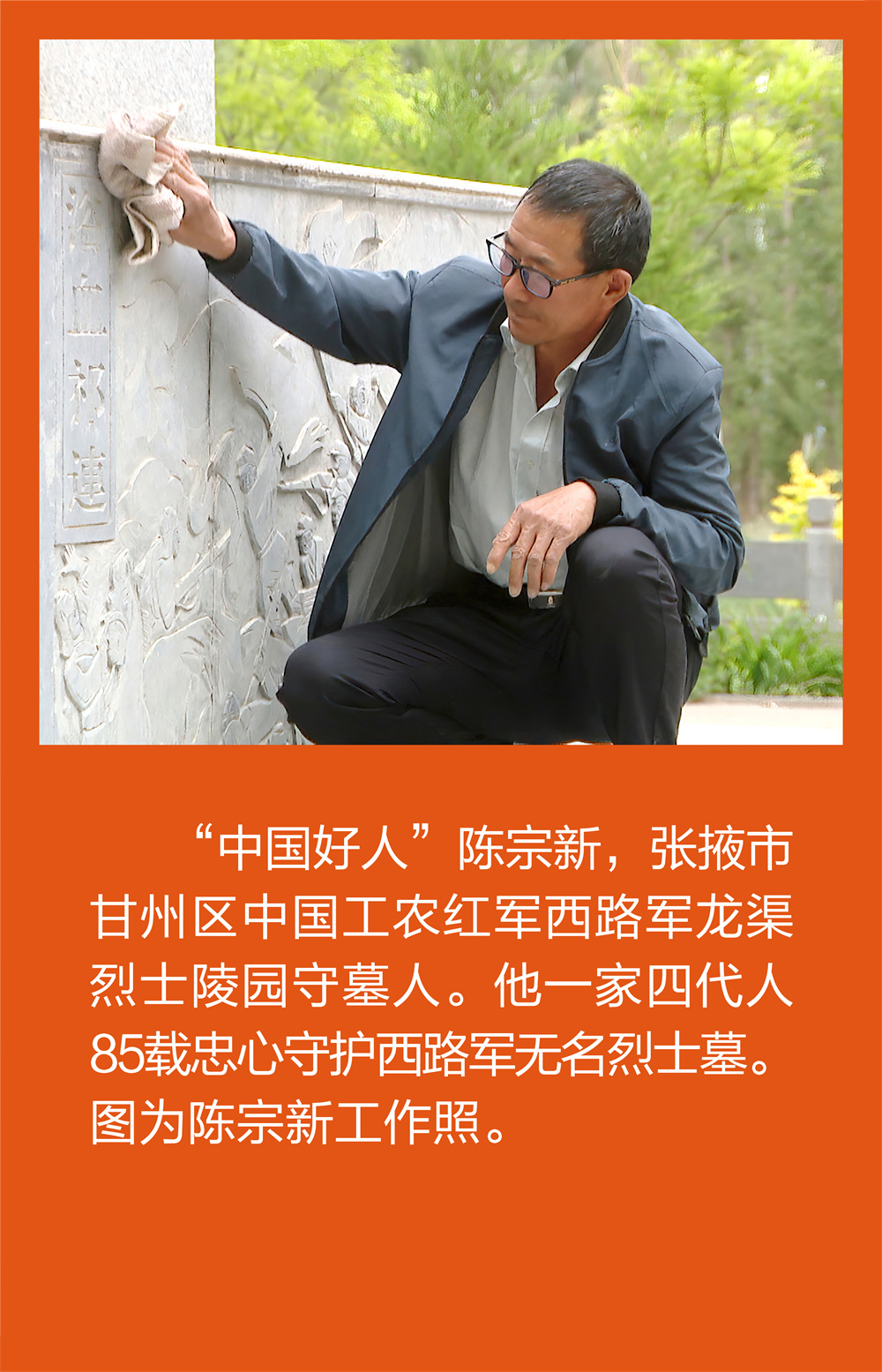 背景资料:陈宗新是甘肃省张掖市甘州区龙渠乡新胜村村民。1937年1月,一支300多人的红军队伍在白城子村遭遇国民党军队包围,缺乏弹药的红军经过一夜战斗全部壮烈牺牲。陈宗新的爷爷陈德宝冒着生命危险,将烈士们的遗体合葬,从此,陈德宝成了红军烈士的守墓人。85年来,陈家四代人一直无怨无悔默默守护着红军烈士墓。陈德宝老人去世后,儿子陈榆林成了第二代守墓人,2002年,陈宗新继承爷爷和父亲的遗志,毅然决然地承担起了守护烈士陵园的重任,成为第三代守墓人,20年来,不管刮风下雨、天寒酷暑,他都定期到陵园擦拭墓碑、种花植树、浇水修枝、清理杂草,守护安葬在龙渠烈士陵园的英魂。如今,第四代守墓人陈梦雪已光荣地成为一名红色教育基地的讲解员,为讲好“西路军在甘州”这堂传承红色基因、赓续革命精神的“历史课”贡献着自己的力量。