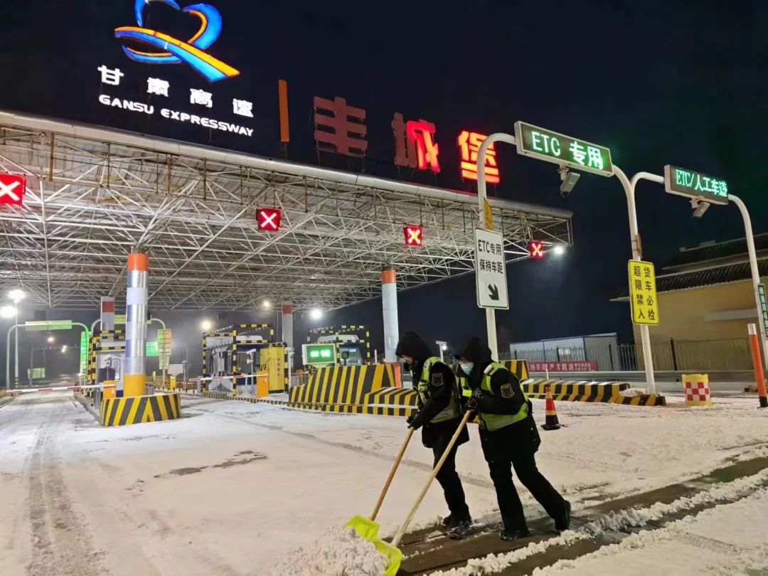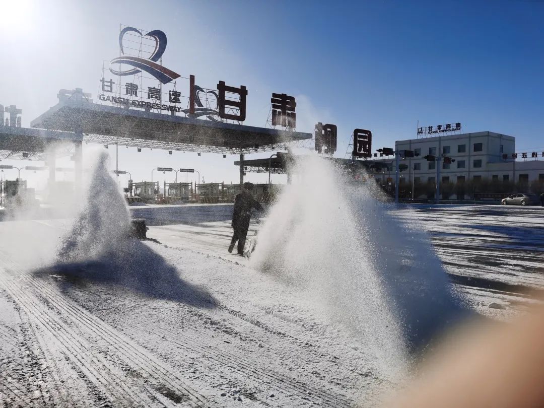 敦煌高速公路处柳园收费所积极应对降雪天气,组织全体职工对收费广场开展打冰除雪工作,保障过往车辆快速安全通行。