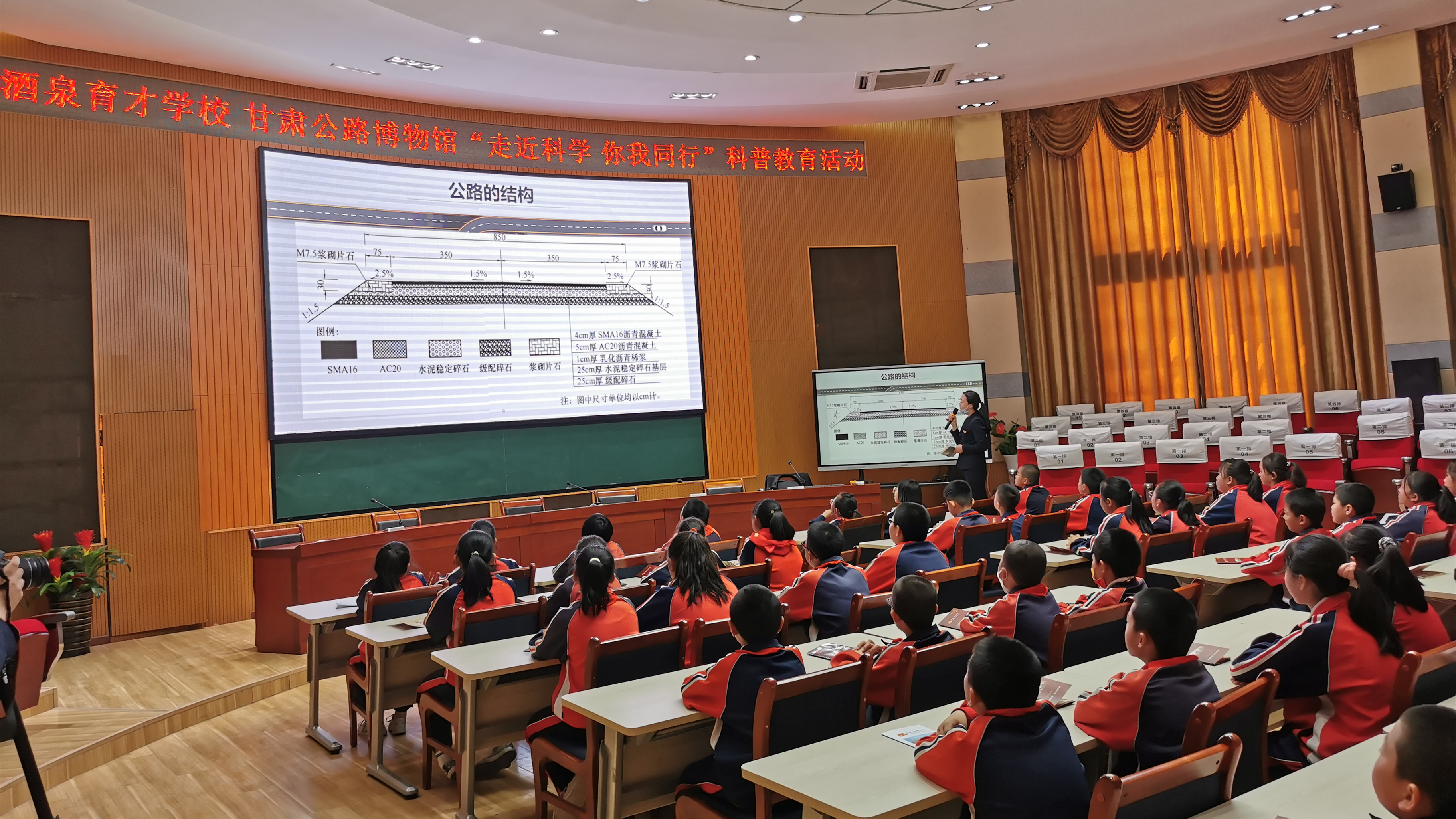 2022年5月16日,甘肃公路博物馆走进酒泉育才学校,进行“走进科学 你我同行”科普社教活动和“立爱国之志 践爱国之行”爱国主义教育,通过讲解国旗国徽的知识和公路的分类及构成,结合展板讲解甘肃公路的发展历程和蕴含的精神,引导和培养少年儿童传承公路文化、弘扬公路精神、树立实现高水平科技自强自立的远大志向、继承和发扬伟大民族精神。