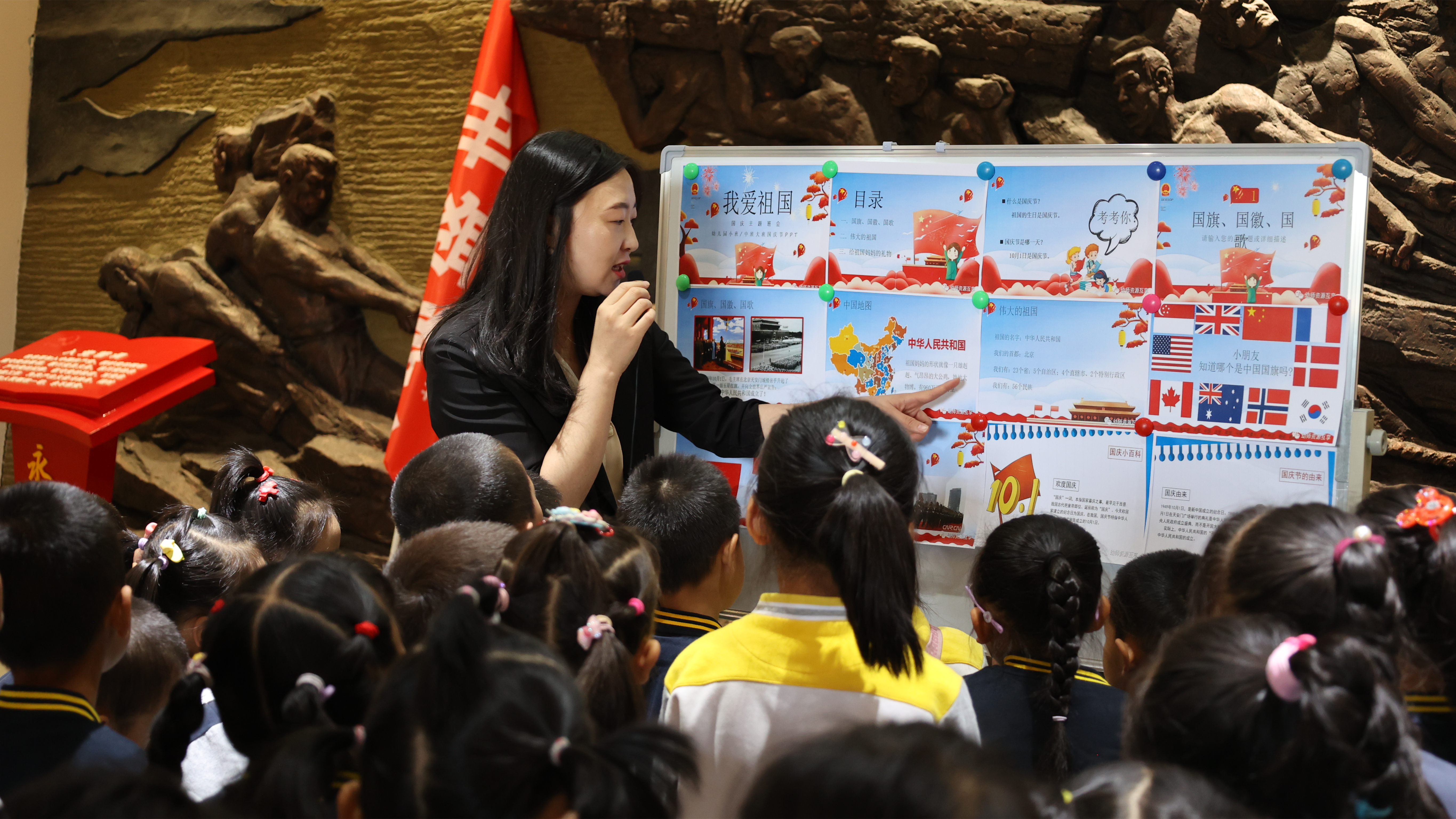 入馆参观前,小朋友们跟随着《歌唱祖国》歌曲声,挥动着手中的国旗,用自己的方式向祖国母亲送上了最为纯真的祝福。在讲解员的带领下,小朋友们跟随讲解员进入博物馆,感受了甘肃的壮美山川,对砂砾路面和柏油马路进行对比,认识到了祖国强大为人民带来了现在的美好生活。讲解员还与小朋友们进行了“我爱祖国”主题知识问答,通过有趣的答题互动,加深了小朋友们对于国庆的节日印象,在小小的心灵中培养了家国情怀。
