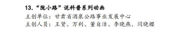 此次由中国公路学会开展的2023年度最受欢迎公路科普作品发布活动,在全国范围内广泛征集并评审,设有图书类、文创类、视频类三个大类,其中视频类科普作品共计15部,由甘肃公路博物馆创作的“陇小路”说科普系列动画获评最受欢迎公路科普作品!