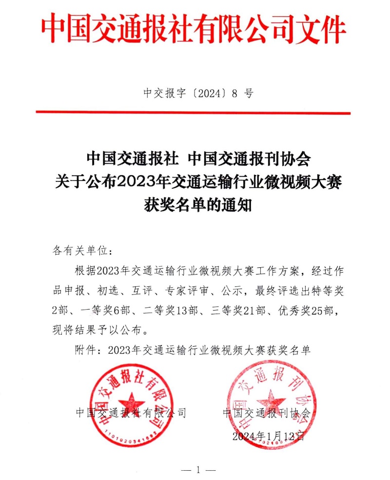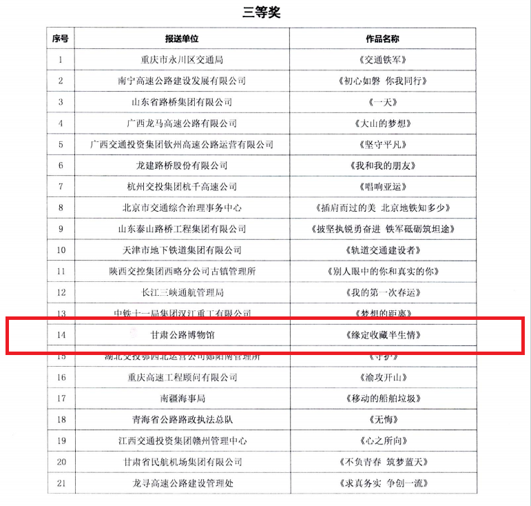 近日,中国交通报社、中国交通报刊协会举办的2023年交通运输行业微视频大赛活动,经过作品申报、初选、互评、专家评审、公示,最终评选出特等奖2部、一等奖6部、二等奖13部、三等奖21部、优秀奖25部。甘肃公路博物馆报送的微视频《缘定收藏半生情》荣获三等奖。