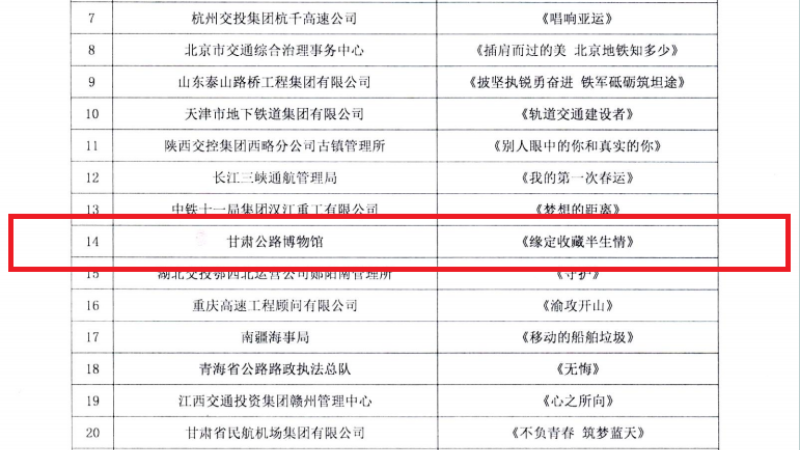 由中国交通报社、中国交通报刊协会公布2023年交通运输行业微视频大赛获奖名单,甘肃公路博物馆作品《缘定收藏半生情》荣获三等奖。