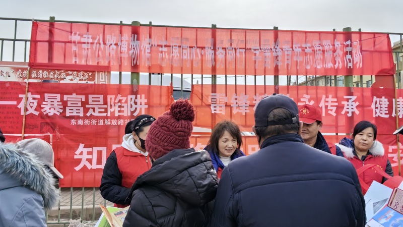 开展政策宣传,文明实践暖人心。结合“3. 5学雷锋纪念日”博物馆女职工在 东南街街道解放路社区红色文化广场开展“志愿同心.服务同行”学雷锋青年志愿服务活动,大家身穿鲜艳醒目的红马甲,向过往人员分发防震减灾及博物馆相关知识宣传彩页,并进行政策宣讲,深化了群众对防震减灾知识和甘肃公路博物馆的了解,提高政策覆盖率、知晓率。