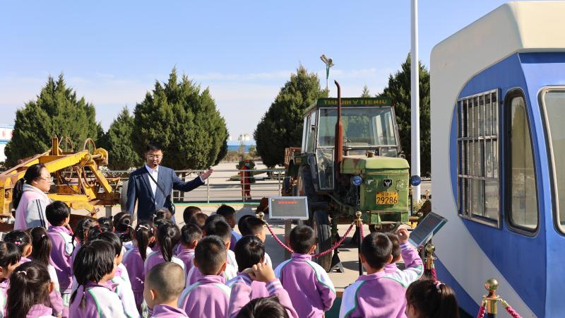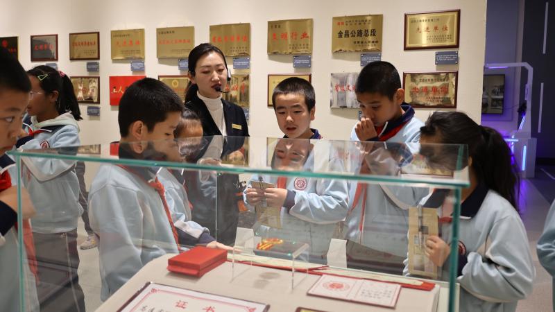 与文物“零距离”,接受文化浸润。走进展厅,学生们的目光立即被“东方红”75型推土机、毛驴刮路车等公路人使用过的设备工具所吸引,一件件意义深刻的革命文物、一张张承载岁月的照片,生动描绘了甘肃公路建设的厚重画卷。当聆听完讲解后,孩子们恍然明白这些“大块头”是如何将粗糙的砂砾路面变成平坦的沥青路面,感叹公路发展的巨变,深刻感受老一辈公路人勇于创新、不怕困难的奋斗精神。