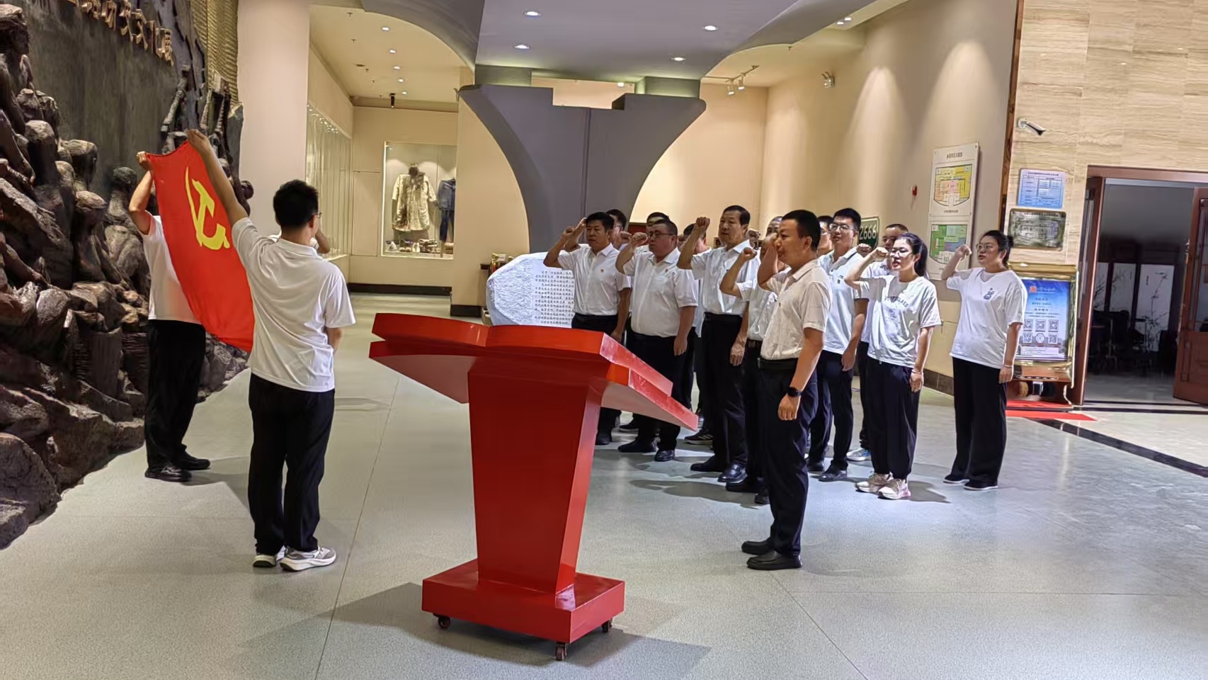 参观过程中,在讲解员的带领下,大家了解了甘肃交通历史文化,仔细聆听老一辈公路人在陇原大地上艰苦奋斗的英勇事迹,从老旧的生产工具和生活用品及老照片中体会到甘肃交通人自力更生、艰苦创业的奋斗精神。在序厅“逢山开路 遇水架桥”的浮雕前,面对鲜红的党旗,多个参观团体举行了重温入党誓词活动。铿锵有力的誓言,表达了党员干部们不忘初心、牢记使命,为党的事业奋斗终身的坚定决心。