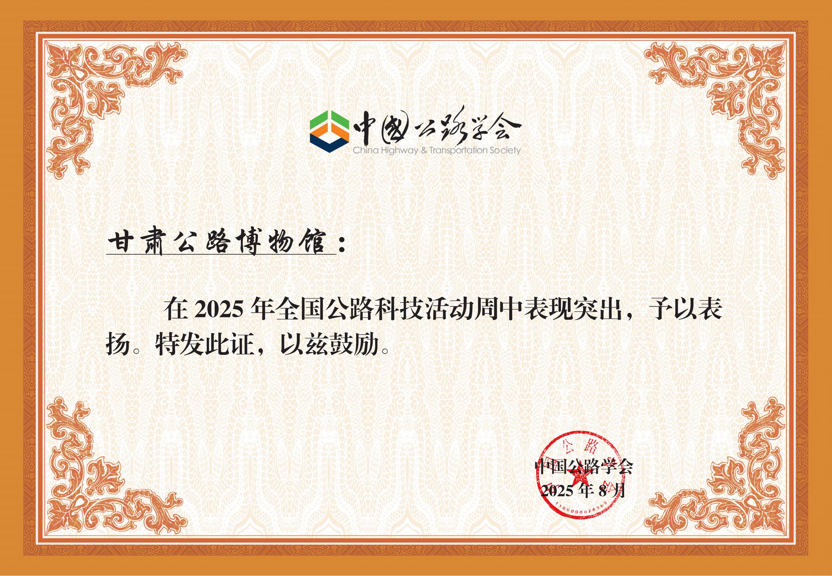 近日,中国公路学会对2025年全国公路科技活动周活动中表现突出的53家单位、36名个人予以表扬。其中,甘肃公路博物馆获中国公路学会“2025年全国公路科技活动周表扬单位”,一名职工被评为“2025年全国公路科技活动周表扬个人”。