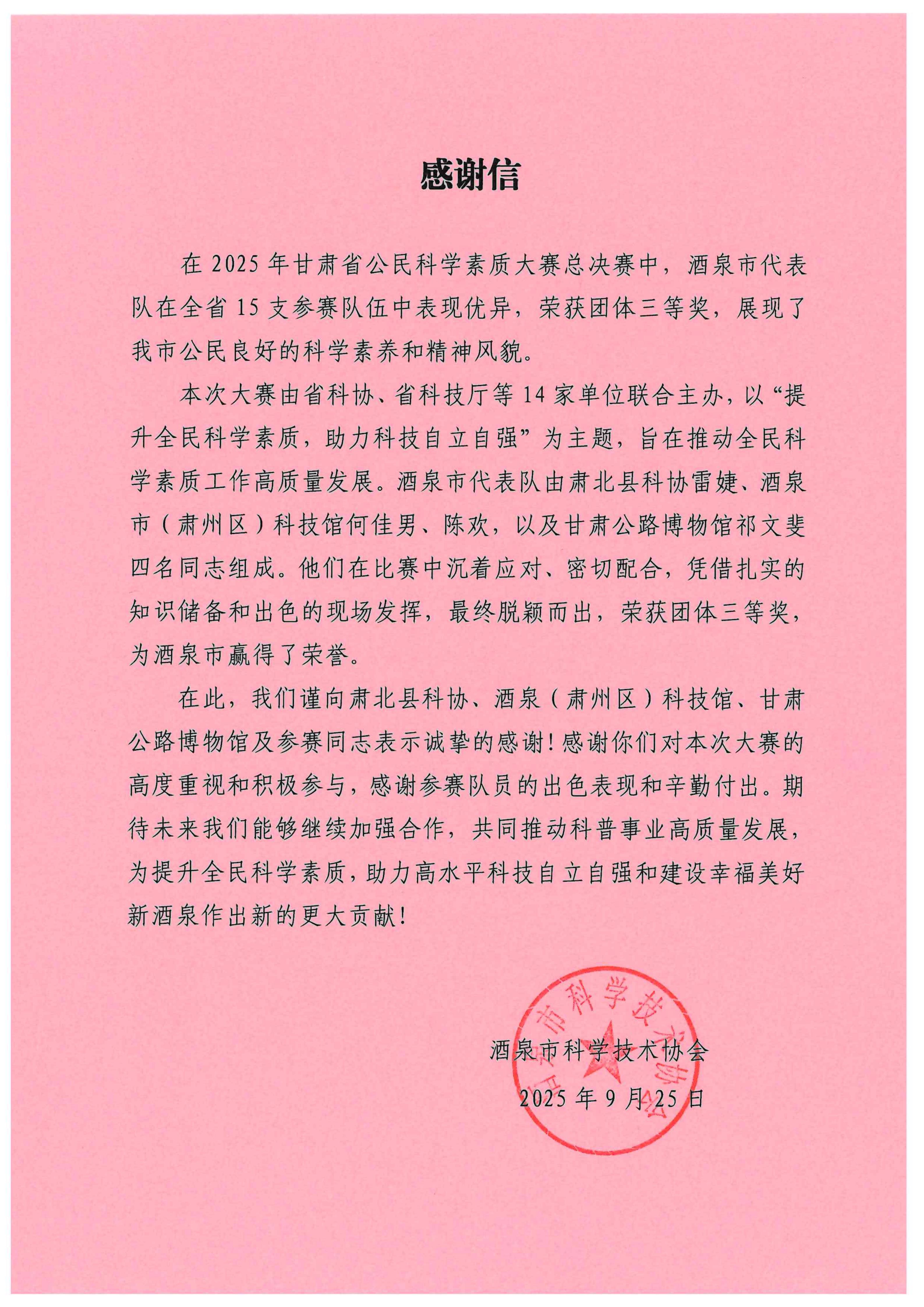 近日,全国科普宣传月期间,甘肃省首届公民科学素质大赛线下总决赛在甘肃省科技馆圆满落幕。来自全省14个市州的15支代表队同台竞技,由甘肃公路博物馆选派青年代表与酒泉市科技馆、市科协青年共同组成的酒泉市代表队,凭借扎实的知识储备、默契的团队协作及出色的临场发挥,最终荣获团体三等奖,充分展现了酒泉市青年科技工作者的科学素养与精神风貌。