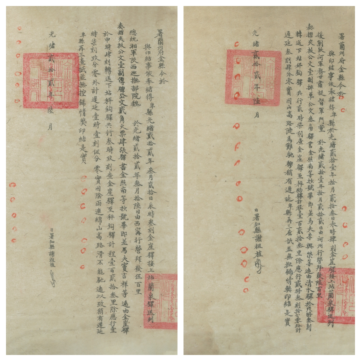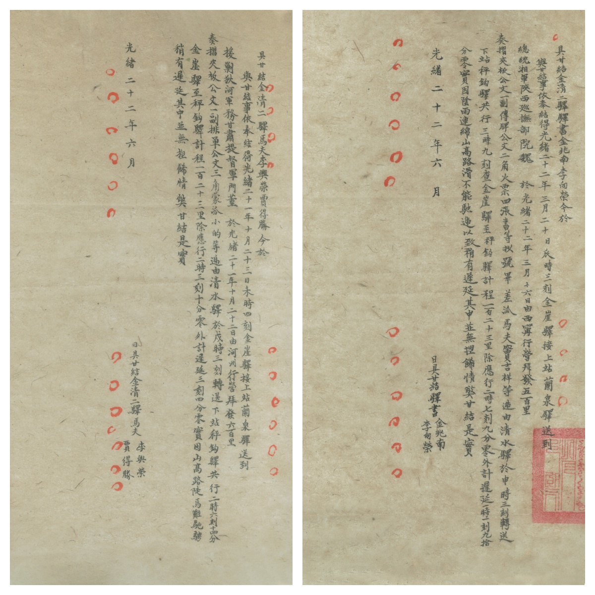 清代甘肃的邮驿制度是国家驿传体系的重要组成部分,是边疆治理与交通一体化的典型,驿站承担着军政通信、边防保障、民族交往等多重功能,由于甘肃地处西北要冲,其驿站网络具有鲜明的军事性、边疆性和多民族性。光绪末年,清廷推行“新政”,甘肃试办文报局,逐步替代驿站传递公文。1913年北洋政府全面裁撤驿站,甘肃驿道被邮政局、电报局取代,部分驿路改建为近代公路。 而这五份驿书正是研究展示改邮撤驿前驿路情况的重要史料。其中留存的清光绪二十二年(1896年)驿书,是研究清代西北驿传制度、邮政运作、地方治理乃至丝路交通网络的第一手“活化石”。这些文书详细记载了公文流转时刻、交接责任、驿道里程等关键信息,兼具邮驿制度细节,填补了区域古道研究中“具象史料缺失”的空白。这些驿书记载翔实,信息价值极高。内容不仅涵盖公文流转时刻、交接责任、驿道里程等,还具体录有马夫姓名、驿站间距、行走耗时、延误原因及核查结论。例如,一份驿书中清晰写道:“金崖驿至秤钩驿计程壹百贰拾三里,应行二时七刻九分处,迟延一时一刻九分,实因阴雨连绵,山高路滑,不能驰骋,以致稍有迟延,其中并无控饰情弊,甘结是实。”此外,文书类型也登记明确,如“奏折夹板公文一副、排单公文三角、传牌公文两角,火票四张”,并可见“拜发五百里”“拜发六百里”等标注,生动体现了清代驿递的等级与效率要求。这些记录,为复原清末兰州附近兰泉驿、金崖驿、秤钩驿、清水驿之间的驿路网络与行路条件,提供了不可多得的精确依据。