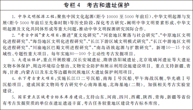 编制并实施“十四五”考古工作专项规划。系统确定考古发掘重点,深化中华文明探源工程,推进“考古中国”重大项目,科学阐释中国境内人类起源、文明起源、中华文明形成、统一多民族国家建立和发展、中华文明在世界文明史中的重要地位等关键问题,揭示中华文明的历史文化价值和核心特质。