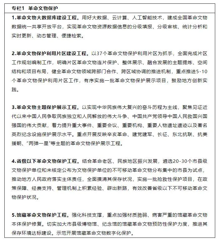 持续开展革命文物资源普查,重点开展反映“四史”的革命文物专项调查。分批公布革命文物名录,及时将重要革命旧址核定公布为各级文物保护单位,在国土空间规划中落实保护革命文物的空间管制措施。做好革命文物征集、定级工作。建成全国革命文物大数据库,规范数据管理,推动开放共享。加强革命旧址保护维修和馆藏革命文物保护修复。全面推进革命文物保护利用片区工作,强化整体规划、连片保护、统筹展示、梯次利用。加强长征文化遗产线路保护。落实革命文物定期风险排查和日常养护管理制度,推动各地加大省级以下革命文物保护力度。推动建设革命文物建筑消防系统,对火灾风险突出的重要革命文物建筑实现消防设施建设全覆盖,筑牢文物安全底线。