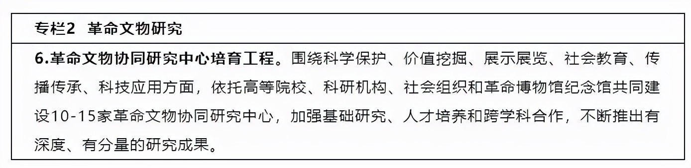 整合文物、党史、军史、档案、地方志方面研究力量,加强中国共产党史、中华人民共和国史、改革开放史、社会主义发展史相关实物、文献、档案、史料、口述史的抢救、征集与研究,加强反映中国特色社会主义新时代历史性成就和历史性变革的实物、藏品征集与研究,深入挖掘革命文物蕴含的思想内涵和时代价值。加强革命文物分类分级管理制度研究,发布革命文物保护利用白皮书。研究起草《长征文物保护条例》,鼓励制定革命文物地方性法规。加强红军标语保护等关键技术研究。支持文物博物馆机构与高等院校、科研机构合作开展革命文物领域课题研究,建设革命文物协同研究中心。