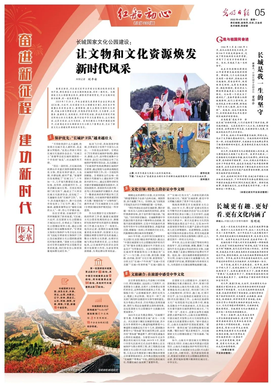 2021年年底,北京印发《长城国家文化公园(北京段)建设保护规划》,提出以“中国长城国家文化公园建设保护的先行区”和“服务首都及国家对外开放的文化金名片”为形象定位。北京市根据历史上长城的军事建制和关口来确定的“五区”——马兰路、古北口路、黄花路、居庸路、沿河城,坚持“文化引领,彰显特色”,分别主打“长城+户外休闲”“长城+历史名镇”“长城+传承样板”“长城+国际名片”“长城+红色文化”,为游客沉浸式体验长城文化、“阅读”长城故事、感受中华文明魅力提供了更多个性化选项。