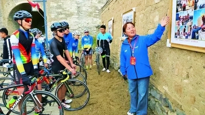 长城卫士”袁建琴在为骑行车手讲解长城摄影展照片背后的长城故事。资料图片