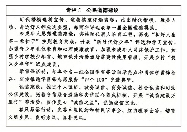 传承弘扬中华传统美德,加强社会公德、职业道德、家庭美德、个人品德建设,加强家庭、家教、家风建设。加强对革命、建设、改革时期各类先进典型的学习宣传,尊崇褒扬英雄模范,关心关爱先进典型人物。健全家庭、学校、政府、社会相结合的思想道德教育体系,把立德树人贯穿学校教育全过程。发挥优秀文化产品陶冶道德情操的作用,完善市民公约、乡规民约、学生守则、团体章程等社会规范,广泛开展弘扬时代新风行动,深化道德领域突出问题治理。加强农村思想道德建设,创新文化科技卫生“三下乡”长效机制。